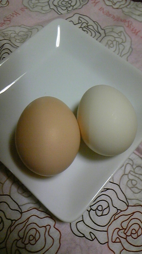 普通の烏骨鶏のタマゴ(左)より白くて一回り小っちゃいタマゴ(右)があったそうです。
